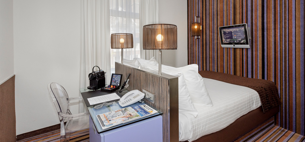 Smartly designed room of 16 sqm and perfect for two persons with twin or double bed, private bathroom with rain shower, free wifi, air conditioning, (laptop) safe, flat screen TV, espresso coffee machine.